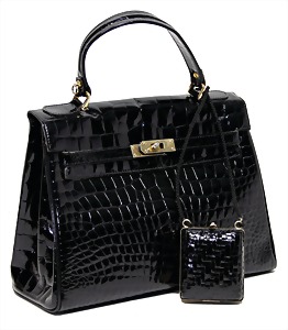 Damenhandtaschen, 1 Handtasche, Kroko-Lack-Optik, 1 gr. Fülltasche mit goldfarbenem Gürtel-Dreh-Verschluss, 1 Seitentasche innen mit Reißverschluss, 1 Tragehenkel, 1 Schultergurt, H: 25 cm, mit Henkel: 35 cm, B: 30 cm, T: 9 cm, dazu 1 Handtasche aus schwarzem Kunststoff, Lack, goldfarbener Verschluss, Trageriemen aus schwarzer Kordel, H: 8 cm, mit Tragekordel: 60 cm, B: 7 cm, T: 5 cm, altersbed. Gebrauchsspuren