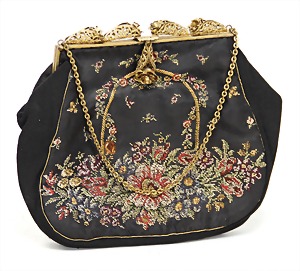 Damenhandtasche, Petit-Point, schwarz, mit goldfarbenem blumenbeschmücktem Metall-Bügel, goldfarbene Tragekette, H: 12,5 cm, mit Trageriemen: 24,5 cm, B: 15,5 cm, T: 3 cm, kl. Brandloch auf der Frontseite, sonst guter Zust.