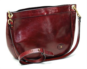Damenhandtasche, Leder, rotbraun, 1 gr. Fülltasche mit Druckknopf, beigefarbener Innenstoff mit Aigner Logo, 1 kl. Seitentasche innen mit Reißverschluss, goldfarbenes Aigner-Emblem innen, mit größenverstellbarem Schulterriemen, typisches goldfarbenes „A“ auf der Frontseite, H: 25 cm, mit Schulterriemen: ca. 66 cm, B: 32 cm, T: 6 cm, altersbed. Gebrauchsspuren, sonst guter Zust.