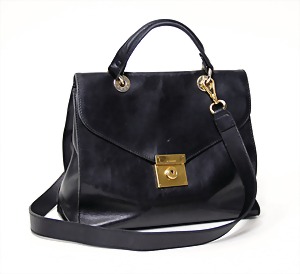 Damenhandtasche, klassisch, Kalbsleder, schwarz, vergoldete Messingbeschläge, mittiger Verschluss mit Schlüssel, Prägung: Jil Sander, Verschluss angeschlagen, kurzer Leder-Trageriemen, sowie Leder-Schulterriemen, innen 2 gr. Fülltaschen, mittiges Fach mit Metallreißverschluss, 1 Seitentasche mit Druckknopf, H: 25, mit Schultergurt: 73 cm, B: 30 cm, T: 11, mit Orig.-Staubbeutel, Abnutzungsspuren an Kanten, genutzter Zust.