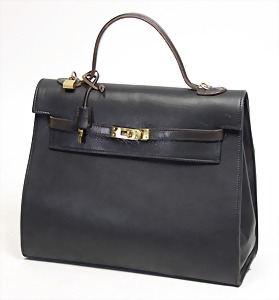 Damenhandtasche, Modell: Kelly Bag, schwarzes Kalbsleder, 1 gr. Fülltasche mit typischem Überschlag und Gürtel-Drehverschluss, Hermès-Paris Gravur auf dem Verschluss und goldfarbenem Hermès Aufdruck innen, mit Schloss Nr. 016 und 2 Schlüsseln, 3 Seitentaschen innen, davon 1x mit Reißverschluss, H: 22,5 cm, mit Henkel: 32 cm, B: 32 cm, T: 12,5 cm, mit Orig.-Staubbeutel, und Einkaufstasche, minim. leichte Kratzer, sonst sehr guter Zust. Schätzwert liegt ca. bei 5.000€