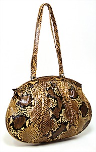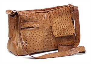 Schultertasche, Straußenleder, braun, 2 Taschen auf der Frontseite, 1 Tasche auf der Rückseite mit Reißverschluss und Druckknopf, 1 gr. Fülltasche mit Reißverschluss, 1 Seitentasche mit Reißverschluss, 1 langer Schultertrageriemen, H: 21 cm, mit Trageriemen: 68 cm, B: 31 cm, T: 9,5 cm, altersbed. Abnutzungsstellen, sonst guter Zust.