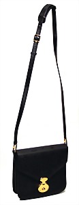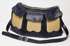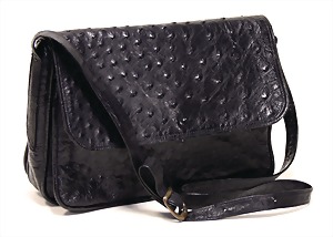 Schultertasche, Straußenleder, schwarz, 3 gr. Fülltaschen, 2x mit Druckknopf, 1x mit Reißverschluss, 1 gr. Umschlag über den Fülltaschen mit Druckknopf, Innenseiten aus dünnem Leder, 1 langer größenverstellbarer Schulterriemen, H: 20 cm, mit Schulterriemen: 64 cm, B: 27 cm, T: 6 cm, altersbed. Abnutzungsstellen, sonst guter Zust.