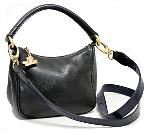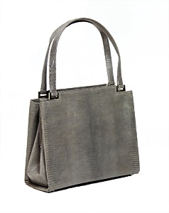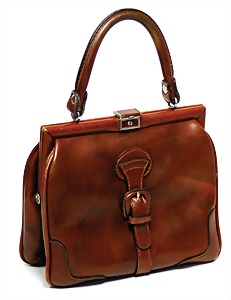Damenhandtasche, Italien, wohl ca. 70er Jahre, dickes schwarzes Rindsleder, vergoldete Beschläge, altersbed. teilw. angelaufen, kurzer Leder-Trageriemen, mit Schloss und Schlüssel, innen bordeauxrotes Wildleder, gr. Fülltasche, 2 Seitentaschen, 1 Seitentasche mit Metall-Reißverschluss, H: mit Tragehenkel 37 cm, B: 33 cm, T: 14 cm, 1 Niete auf der Hinterseite fehlt, altersbed. leichte Abnutzungsstellen, sonst guter Zust.