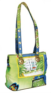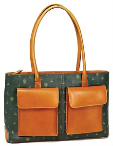 Damenhandtasche, grün, mit Hirschmotiv, 1 gr. Fülltasche mit Reißverschluss, 2 Seitentaschen, davon 1x mit Reißverschluss, grüner Innenstoff, 2 Außentaschen mit Magnetverschluss, 2 Leder-Tragehenkel, H: 23,5 cm, mit Henkel: 46 cm, B: 37,5 cm, T: 9 cm, leichte Abnutzungsstellen am Tragehenkel, sonst guter Zust.