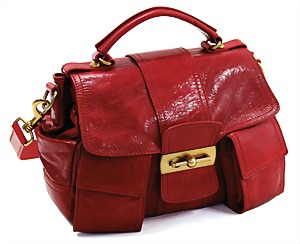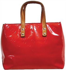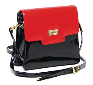 Damenhandtasche, Lack, schwarz, rot, 1 gr. Fülltasche mit Überwurf und Magnetverschluss, schwarzer Innenstoff, silber- und goldfarbene "Claudia M." Plakette auf der Frontseite, 1 abnehmbarer größenverstellbarer Schultertrageriemen, H: 18 cm, B: 19,5 cm, T: 6 cm, guter Zust.