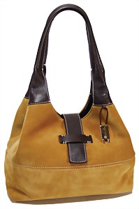 Damenhandtasche, made in Italy, feines Wildleder, caramellfarben, mit weichem dunkelbraunem Kalbsleder, abgesteppte weiße Nähte, Verschluss mit Lederlasche und Magnetknopf sowie innen mit Druckknöpfen, Innenfutter, abwaschbarer Baumwollstoff, gr. Fülltasche, seitl. 2 Seitentaschen, 1 Seitentasche mit Reißverschluss, goldene Messingbeschläge, Boden verstärkt durch 2 Ledereinsätze, H: 22 cm, mit Trageriemen: 44 cm, B: 28 cm, T: 15 cm, neuw. Zust.
