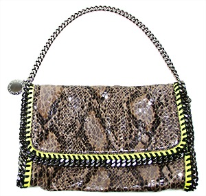 Damenhandtasche, Clutch, Python-Leder-Optik, 1 gr. Fülltasche mit Überschlag und Magnetverschluss, 1 Seitentasche innen, rosefarbener Innenstoff, neongelbfarbener Rand mit anthrazitfarbener Kette, runde silberfarbene Stella McCartney-Plakette seitlich, 1 anthrazitfarbener Kettentragehenkel, H: 18,5 cm, mit Henkel: 42 cm, B: 30 cm, T: 3 cm, neuw. Zust.
