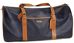 Reisetasche, dunkelblau mit braunem Rindsleder, 1 gr. Fülltasche mit Reißverschluss, 1 Seitentasche mit Reißverschluss innen, beiger Innenstoff, 1 Außentasche auf der Frontseite mit goldfarbener Escada Plakette, 2 größenverstellbare Schultertragehenkel, H: 30 cm, mit Henkel: ca. 63, B: 65 cm, T: 40 cm, leichte Abnutzungsspuren, sonst guter Zust.