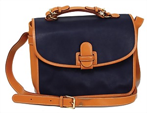 Damenhandtasche, dunkelblau mit braunem Rindsleder, 1 gr. Fülltasche mit Überschlag, 1 Seitentasche mit Reißverschluss, 1 Seitentasche mit Reißverschluss innen, beigefarbenes weiches Kalbsleder innen, beiges Leder Escada-Emblem innen, 1 größenverstellbarer Leder-Tragehenkel, 1 größenverstellbarer Schultertrageriemen, H: 23 cm, mit Henkel: ca. 32 cm, B: 30 cm, T: 14 cm, Trageriemen an manchen Stellen verschmutzt, sonst guter Zust.