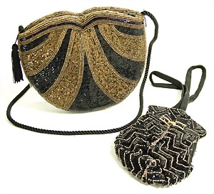 2 Damenhandtaschen, ca. 1930, mit reichh. Perlen bestickt, schwarz und goldfarben, guter Zust.