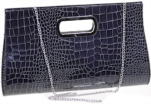 Damenhandtasche, Clutch, Lack-Kroko-Optik, dunkelblau, silberne Messingbeschläge, 1 gr. Fülltasche mit Magnetverschluss, 1 Seitentasche, H: 20 cm, B: 28 cm, neuw. Zust.