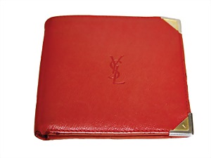 Geldbörse, rot, Leder, 1 Münzfach mit Druckknopf, 4 Kartenfächer, 3 Geheimfächer, 1 Scheinfach aus roter Seide nit "YSL" Logo, goldfarbener "Yves Saint Laurent" Schriftzug innen, "YSL" Prägung auf der Front, altersbed. Gebrauchsspuren, sonst guter Zust.