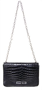 Damenhandtasche, ca. 1950, schwarzes Lack-Krokodilleder, 1 gr. Fülltasche mit Überschlag und Druckknopf, 1 Seitentasche mit Reißverschluss innen, schwarzes Leder innen, silberfarbene CD Letter mittig auf der Frontseite, weiches Kalbsleder innen, 1 silberfarbener Kettentrageriemen, H: 15 cm, mit Riemen: 53 cm, B: 22 cm, T: 7 cm, altersbed. Abnutzungsstellen