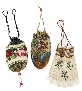 3 Geldkatzen, Biedermeier, mit reichh. Perlenstickerei, florale Muster, H: 16 cm, davon 2 im guten Zust. 1 mit Loch und altersbed. Perlenverlust