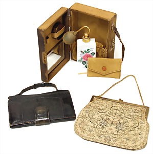3 Handtaschen, untersch. Alter, untersch. Design, untersch. Materialien, davon 1 Tasche Koffer ähnlich mit Spiegel innen und Taschen, zusätzlich 1 Parfumflacon und Döschen im Inneren, H: 10-14 cm, B: 13-15 cm, altersbed. Gebrauchsspuren