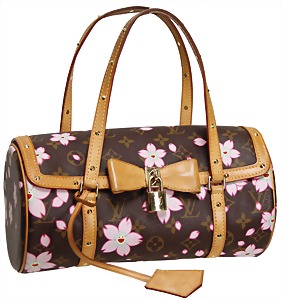 Damenhandtasche, Modell: Cherry Blossom Papillon Takashi Murakami, limitierte Edition, 1 gr. Fülltasche mit Magnetverschluss, beigefarbenes Wildleder innen, mit goldfarbenem LV-Schloss Nr. 314 mit 2 Schlüsseln, (1 Schraube am Verschluss im Inneren fehlend), 2 beigefarbene Leder-Tragehenkel, H: 14,5 cm, mit Henkel: 28 cm, B: 28 cm, T: 13 cm, mit Orig.-Staubbeutel und Kopie der Rechnung, guter Zust.