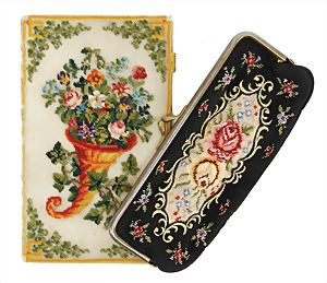 Geldtasche, früh, schwarz mit Blumenstickerei, H: 6,5 cm, B: 15 cm, dazu ein beidseitig besticktes Notizbuch, H: 15 cm, B: 9 cm, T: 1 cm, altersbed. Gebrauchsspuren, sonst guter Zust.