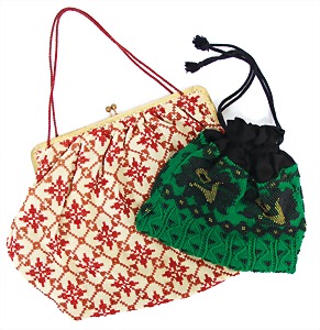 2 Damenhandtaschen früh, 1 x Geldkatze, grün mit schwarzen und goldenen Perlen, H: 15 cm, B: 18 cm, 1 x handgestickte Tasche, beige mit roter Stickerei, H: 21 cm, B: 28 cm, guter Zust.