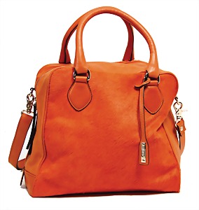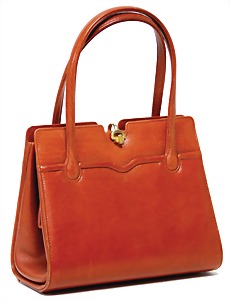 Damentasche, orange, Front- u. Rückseite mit Fellbesatz und Leder, 2 Tragehenkel, 1 abnehmbarer Schultertrageriemen, Innenfutter aus Kunstseide, 3 Seitentaschen, 1 Seitentasche mit Reißverschluss, goldene Messingbeschläge, H: 27 cm, mit Tragehenkel: 43 cm, B: 36 cm, T: 11 cm, sehr guter Zust.