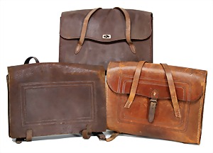 3 Schulranzen, früh, ca. 1930, 2x dunkelbraun, 1x hellbraun, rechteckig, größenverstellbare Trageriemen, H: ca. 28 cm, B: ca. 32 cm, T: 7-9 cm, altersbed. Gebrauchsspuren