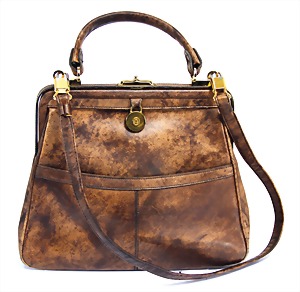 Damenhandtasche, braunes Leder, 1 gr. Fülltasche mit Taschenbügel-Druckverschluss, 1 Seitentasche außen, 2 Seitentaschen innen, davon 1x mit Reißverschluss, braun/blauer Innenstoff mit Goldpfeil-Logo, 1 Tragehenkel, 1 Schultertrageriemen, H: 24 cm, mit Henkel: 33,5 cm, B: 29 cm, T: 5 cm, altersbed. Gebrauchsspuren, sonst guter Zust.