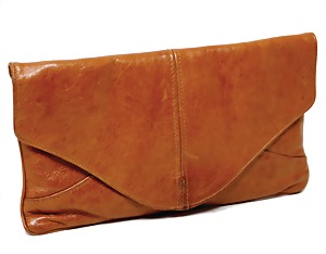 Damenhandtasche, Clutch, Leder, cognacfarben, 1 gr. Fülltasche mit Überwurf und Magnetverschluss, 1 Seitentasche mit Reißverschluss innen, braunes Leder innen, H: 16,5 cm, B: 31 cm, T: 1 cm, leichte Gebrauchsspuren, sonst guter Zust.