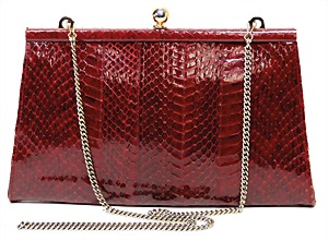 Damenhandtasche, Clutch, bordeauxrot, 1 gr. Fülltasche mit Taschenbügel, 1 Seitentasche mit Reißverschluss innen, schwarzer Innenstoff, 1 abnehmbarer Kettentrageriemen, H: 15,5 cm, mit Riemen: 56,5 cm, B: 25 cm, T: 2,5 cm, leichte Gebrauchsspuren, sonst guter Zust.