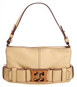 Damenhandtasche, hochwertiges Rindsleder, beige, mit Gürtelaufsatz, ESCADA Emblem in Holzoptik auf Frontseite, goldene Messingbeschläge, Innenfutter, abwaschbarer Baumwollstoff, 1 gr. Fülltasche, 1 Seitentasche, H: 16 cm, mit Trageriemen: 35 cm, B: 27 cm, T: 4,5 cm, neuw. Zust.