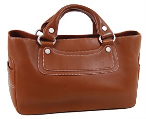Damenhandtasche, weiches Kalbsleder, braun, silberne Messingbeschläge, abgesteppte weiße Nähte, 2 Tragehenkel, 2 gr. Fülltaschen, mittig 1 Fülltasche mit Reißverschluss, orig. Staubbeutel, H: 19 cm, mit Tragehenkel: 29 cm, B: 34 cm, T: 14 cm, neuw. Zust.