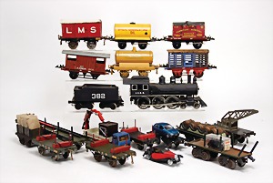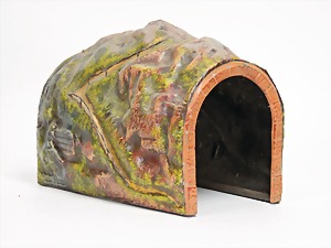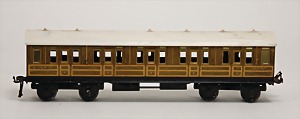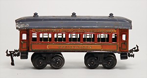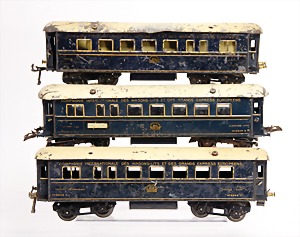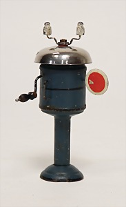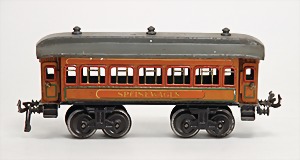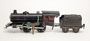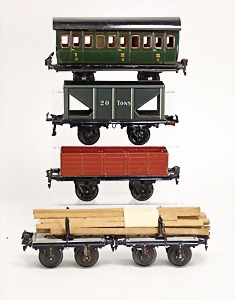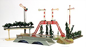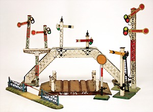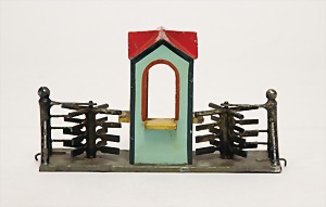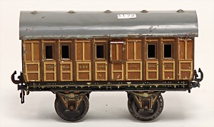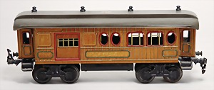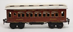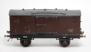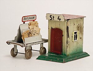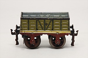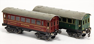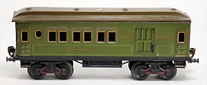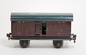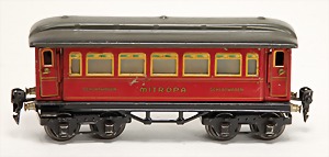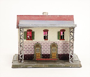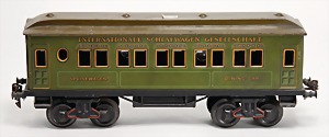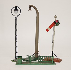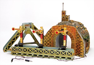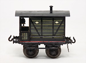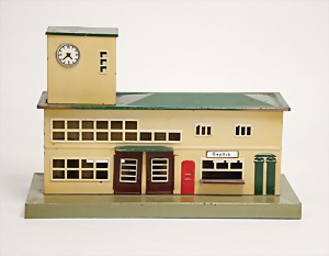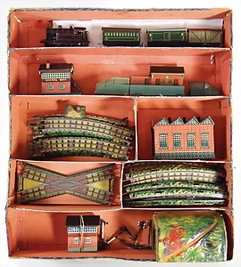 02010, Zentralbahnhof, hellgrün, bunt, Steinprägung, Mitteldurchgang, mit 2 Geländer, Wartesaal, Telegraph, farbige Glasfenster, Kerzenbeleuchtung, roter Kamin, 6-fach Isolator, seitl. je 1 kl. gebogenes Zierdach, Bahnsteiggeländer, Sperre, 34 x 20 x 5 x 38, 1902 – 1914, Dach- u. Bodenplatte wohl in früher Zeit 1 x überstrichen, 1 Isolatorenpaar fehlt, Schild Fahrtkarten bereit halten, orig., seil. Schilder Abfahrt fehlen, 1 Ecke Geländer fehlt, eingestaubter Dachbodenfund mit Wachsresten, Brandfleck an 1 Tür, schöne kräftige Farben