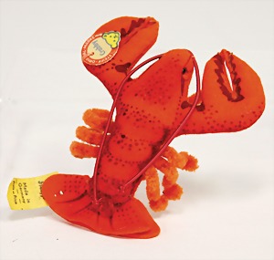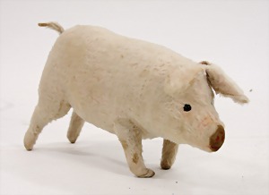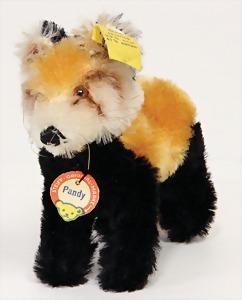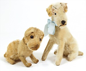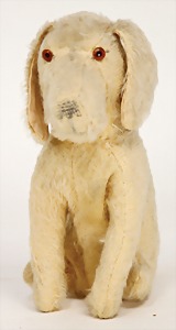 Hund, sitzend, helles Mohair, stärker abgeliebt, fest gestopft, Sitzhöhe 22 cm, Druckstimme defekt, Naht unter einer Pfote etwas aufgegangen