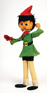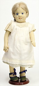 Filz-Puppe, 40 cm, Mittelkopfnaht, blaue Glasaugen, eingesetzte Mohairperücke, Filz an kl. Stellen im Gesicht u. am Körper beschädigt, bewegl. Arme u. Beine