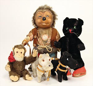 Mecki, mit Knopf, Schild u. Fahne, Nr. 8717,70, 17 cm, kl. Affe, 11 cm, Kersa Kater, 15 cm, 1 Stiefel an der Sohle aufgegangen, dazu 2 Hunde, Kunstplüsch, mit Leine, 10 cm