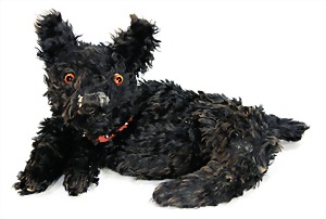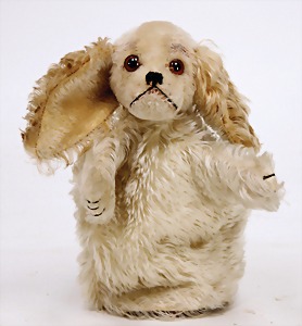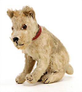 Hund, mit Musikspielwerk, 30er Jahre, Sitzhöhe 18 cm, Druckspieldose intakt, altersbed. Mohairverlust, schöne Puppendekoration