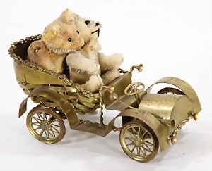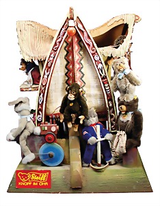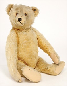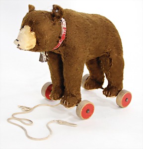 Bär, ca. 1930, auf 4 Pfoten stehend, Holzräder, 36 cm, mit Knopf, Schnauze berieben, Nasenbestickung fehlt, 1 Ohr an einer Seite gelöst, wenige Stellen Mohairverlust, Filz bis auf kl. Stelle gut