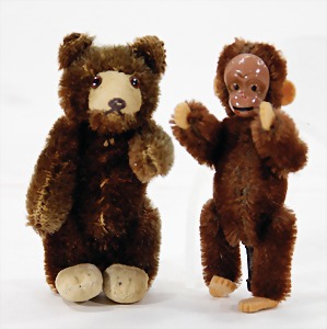 Teddybaby, ohne Knopf, Schild u. Fahne, 9 cm, dazu kl. Affe, wohl Schuco, mit Blech-Gesicht, bewegl. Arme u. Beine, 8 cm, mit kl. Hebel zur Bewegung des Kopfes u. der Zunge, Zunge leider nicht sichtbar
