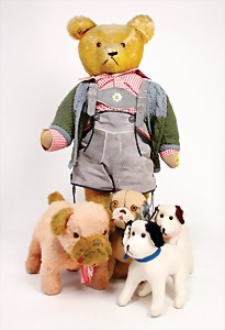 4 Hunde, Stoff, 30er – 50er Jahre, H: 22 – 28 cm, 1 Bär Sonneberg, 69 cm, gelb, leicht abgeknickte Arme, Tatzen übernäht, Mohair teilw. etwas abgeliebt