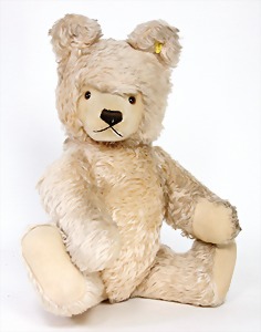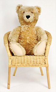 Bär, mit Knopf, goldfarbenes Mohair, 65 cm, mit Brummstimme, Glasaugen, mit 1 Kinder-Korbsessel