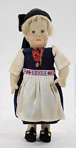 Filzpuppe, blaue eingesetzte Glasaugen, Mohairperücke, lose angenähte Arme, bewegl. Beine, 32 cm, alte Kleidung (Tracht)