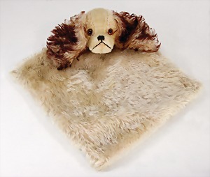 Pyjamahund, liegend, 50 cm, Mohair, mit Reissverschluß, Tasche mit violettem Samt gefüttert, bis auf kl. Stellen Mohairverlust gut