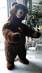 Studiotier, Braunbär, 1,65 m, blanker, goldener Knopf, Papierfahne, mit Schild, wohl 80er/90er Jahre, schöner Orig.-Zust.