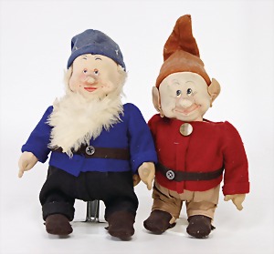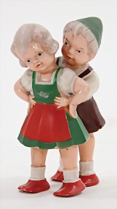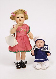 2 Celluloid-Puppen, 1 x Kämmer & Reinhardt, Nr. 728, braune fest eingesetzte Glasaugen, off. Mund, 2 Zähne oben, Echthaarperücke aufgeklebt, auf Celluloid-Stehkörper, bewegl. Arme u. Beine, 24 cm, alte Kleidung, 1 x Paul Huneus, Celluloid-Junge, gem. Germany 18, fester Kopf braune gemalte Augen, Celluloid-Sitzbabykörper, 17 cm