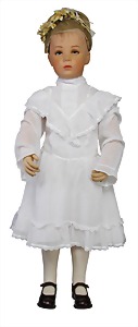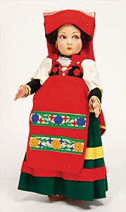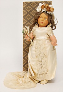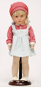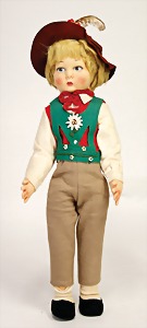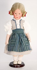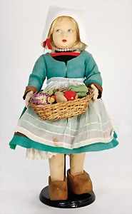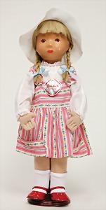 Mädchen, in Tracht, Filz-Kopf u. -Körper, gemalte Augen, Echthaarperücke, 36 cm, unbespielter Zust., im Orig.-Kart., Deckel fehlt, Kart. seitl. eingerissen