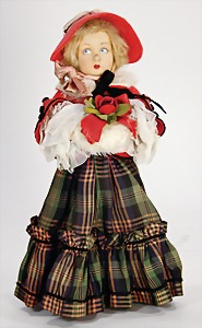 Mädchen, 37 cm, Filzpuppe Italien, blaue, seitl. blickende, gemalte Augen, Orig. Kleidung mit Hut und Muff, 2 Finger zusammengenäht, Nasenspitze ein wenig berieben, sonst schöner Orig.-Zust., ca. 1920