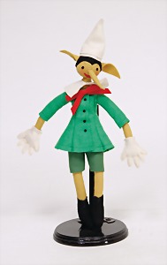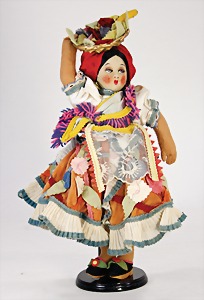 Filzpuppe, Italien, Holländerin, 37 cm, blaue, seitl. blickende, gemalte Augen, 2 Finger zusammengenäht, Orig. Kleidung mit Holzpantoffeln, kl. Fehlstellen an der Kleidung, altersbedingt
