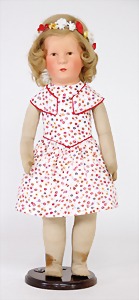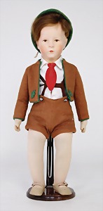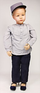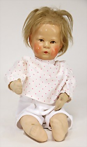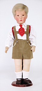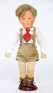 Friedebald, 48 cm, Stoff-Kopf, Hinterkopfnaht erst unter der Perücke sichtbar, früher Körper mit abgenähten Kniekehlen, leicht eingeknickt, evtl. Reparatur bei Käthe Kruse, Nase ein wenig bestoßen, Kopf sitzt locker in der Pfanne, minim. Krakeleebildung auf der Stirn