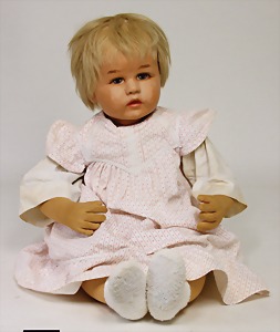 Deutsches Kind, Ilsebill, 50 cm, Stoffkopf, deutlich sichtbare Hinterkopfnaht, leicht abgeknickte Beine, mit abgenähten Kniekehlen, Kopf kompl. übermalt, nur unter UV-Licht sichtbar
