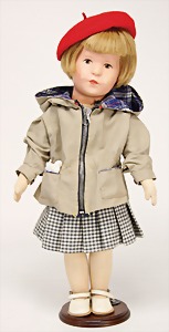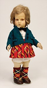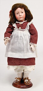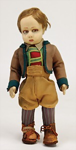Künstlerpuppe, ca. 1910, 30 cm, Masse-Kopf, braune gemalte Augen, geschl. Mund, Mohairperücke, Gliederkörper, alte Orig.- Kleidung u. Schuhe