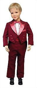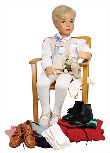 Schaufensterpuppe, 1,10 m, Junge, braune gemalte Augen, aufgesetzte Wimpern, kl. Fleck auf der Stirn, Nasenspitze minim. berieben, Stoff am Körper gut, Orig.-Perücke mit Druckknöpfen, alte Kleidung u. Schuhe